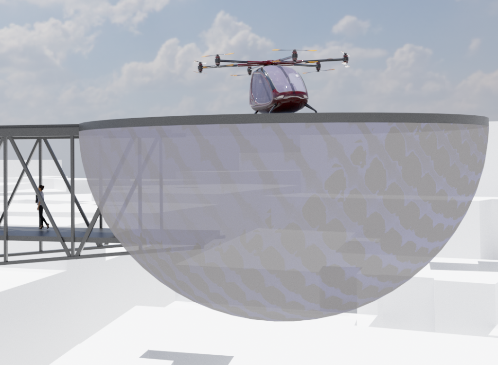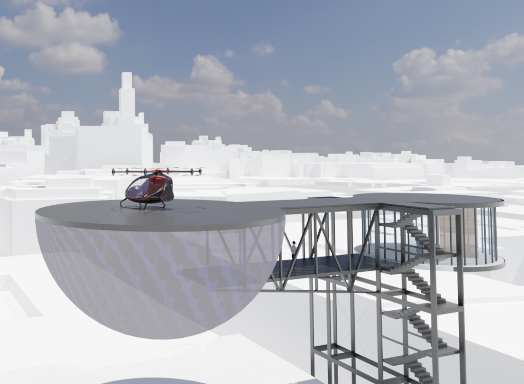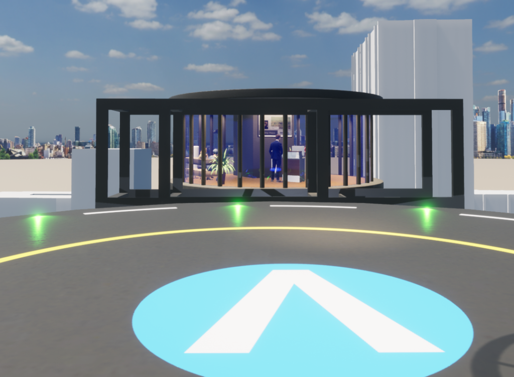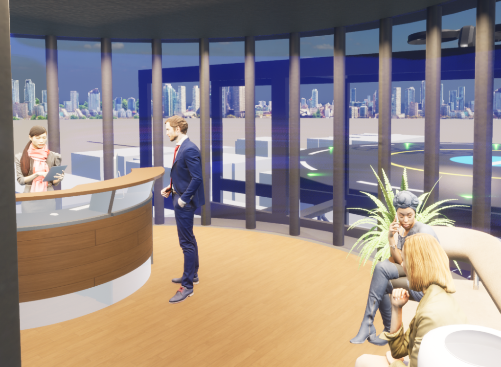 Elevado sobre la ciudad, es el espacio perfecto para esperar tu vuelo en eVTOL.