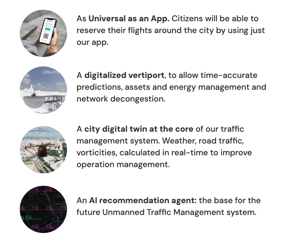 We are building a Vertiports Network, dense enough to reach every use-case, to reduce citizens commuting time, and making Urban Air Mobility as universal and accesible as possible.